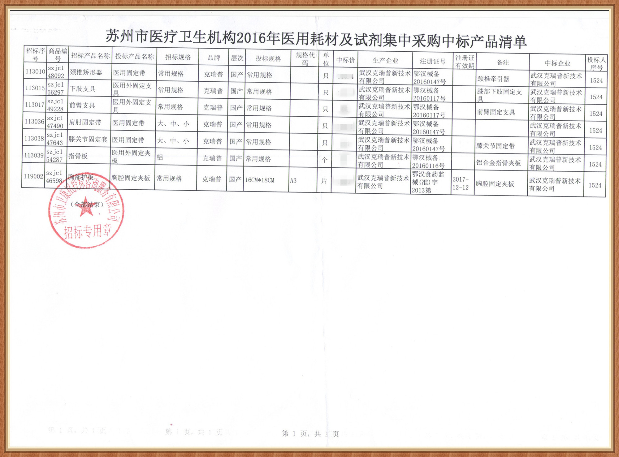 【江蘇省蘇州市醫(yī)療衛(wèi)生機(jī)構(gòu)2016年醫(yī)用耗材及試劑集中采購中標(biāo)通知書】我們武漢克瑞普新技術(shù)有限公司很有幸的在蘇州市醫(yī)療衛(wèi)生機(jī)構(gòu)2016年醫(yī)用耗材及試劑集中采購招標(biāo)中我們成功中標(biāo)了,那么我們這次中標(biāo)的產(chǎn)品有胸部護(hù)板、指骨板、膝關(guān)節(jié)固定套、肩肘固定帶、前臂支具、下肢支具及頸椎矯形器等骨科耗材產(chǎn)品,我們的產(chǎn)品種類較為多樣歡迎各大經(jīng)銷商與我們聯(lián)系。