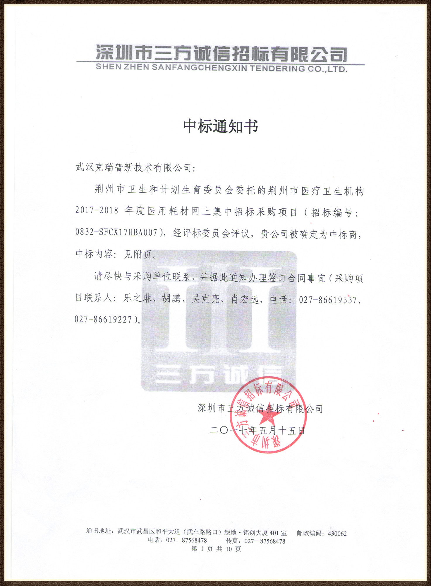 【湖北省荊州市衛(wèi)生機構2017-2018年度醫(yī)用耗材網(wǎng)上集中招標采購項目中標通知書】武漢克瑞普在2017-2018年度荊州市醫(yī)用耗材集中招標采購項目中成功中標了以下骨科耗材產(chǎn)品具體有:胸腔固定夾板、高分子固定繃帶、高分子固定夾板、醫(yī)用固定帶(種類包含多樣)、醫(yī)用外固定支具等骨科耗材在評標委員會的評判下我司被確定為中標商。
