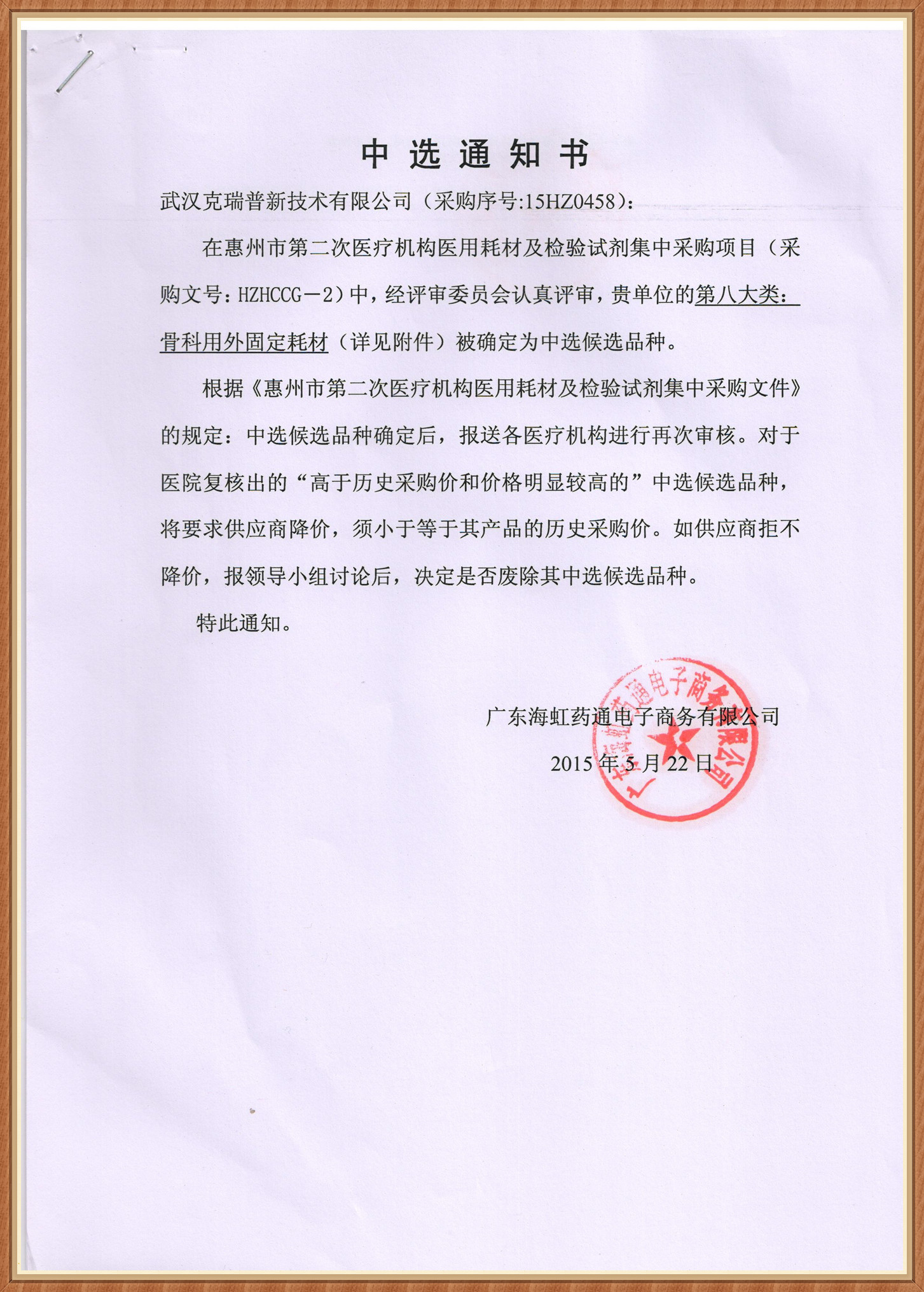 【廣東省惠州市第二次醫(yī)用機構醫(yī)用耗材及檢驗試劑集中采購項目中選通知書】我們武漢克瑞普根據惠州市第二次醫(yī)用機構醫(yī)用耗材及檢驗試劑采購項目進行評選,我公司的骨科耗材成功通過了審核成為了中選產品。