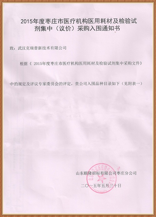 【山東省2015年度棗莊市醫(yī)療機(jī)構(gòu)醫(yī)用耗材及檢驗(yàn)試劑集中(議價(jià))采購(gòu)入圍通知書(shū)】武漢克瑞普出品的胸腔固定夾板經(jīng)過(guò)委員會(huì)專(zhuān)家評(píng)定,我公司的產(chǎn)品成功中標(biāo)入圍,本次中標(biāo)產(chǎn)品數(shù)量較少我們的胸骨固定板是由高分子納米材料、記憶鋁合金板、多頭胸背部肋骨固定帶等組成,使用方便患者使用過(guò)程中不會(huì)感到有束縛感同時(shí)還可以緩解患者的呼吸。
