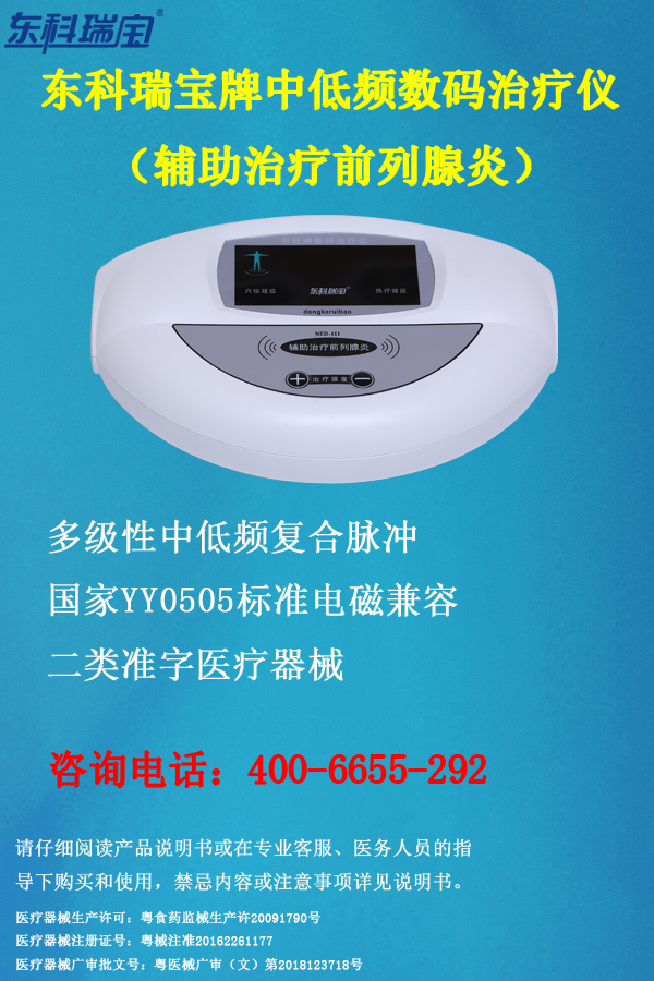 東科瑞寶前列腺治療儀器(官網(wǎng):m.jiaqishun.cn),為中低頻數(shù)碼治療儀,用于輔助治療前列腺炎等疾病,屬于國家二類醫(yī)療器械產(chǎn)品,由治療儀主機、導電理療電極片、DC導線、前列腺儀器設(shè)備專用固定帶等配件耗材組成。