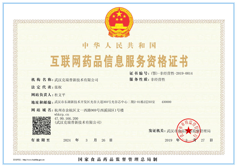 武漢克瑞普新技術(shù)有限公司于2019年3月27日取得了湖北省武漢市食品藥品監(jiān)督管理局(武漢市市場監(jiān)督管理局)頒發(fā)的《互聯(lián)網(wǎng)藥品信息服務(wù)資格證書》,公司網(wǎng)站 whkrp.cn,該證書編號:(鄂)-非經(jīng)營性-2019-0014,互聯(lián)網(wǎng)藥品信息服務(wù)資格證書***期為2019年3月27日至2024年3月26日止。