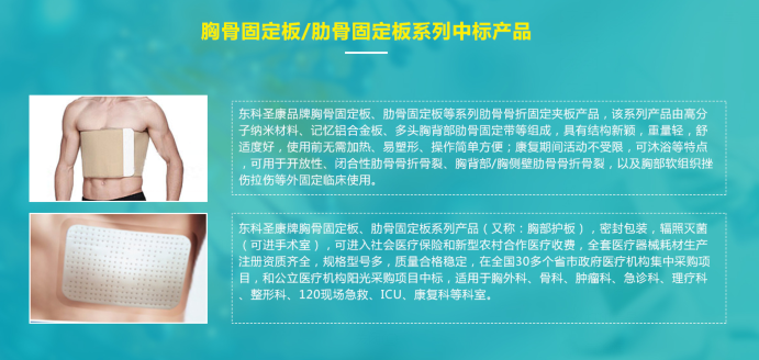 東科圣康牌胸骨肋骨固定板分術前、術后專用型兩大類,產(chǎn)品由高分子納米材料、記憶鋁合金板、多頭肋骨固定帶組成,具有結(jié)構好,重量輕體驗度好,無需加熱,操作簡單方便等特點??捎糜诠强?、胸外科、急診科等科室的胸背部閉合性、開放性肋骨骨折的固定復位保護,公立醫(yī)療機構政府陽光采購中標產(chǎn)品。