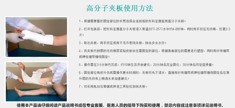 如果我們準(zhǔn)備使用高分子繃帶夾板,要注意的是每次打開一個(gè)包裝要立即使用,而且只能打開一個(gè),不要同時(shí)打開多個(gè)包裝,這樣做是為了防止高分子繃帶夾板遇潮變硬,影響其固定過(guò)程中的使用強(qiáng)度。此外,我么東科圣康品牌的高分子繃帶夾板應(yīng)貯存在陰涼干燥、濕度低于RH`,空氣流通的地方,使用高分子繃帶夾板時(shí)建議由有資格的醫(yī)生操作或指導(dǎo)。
