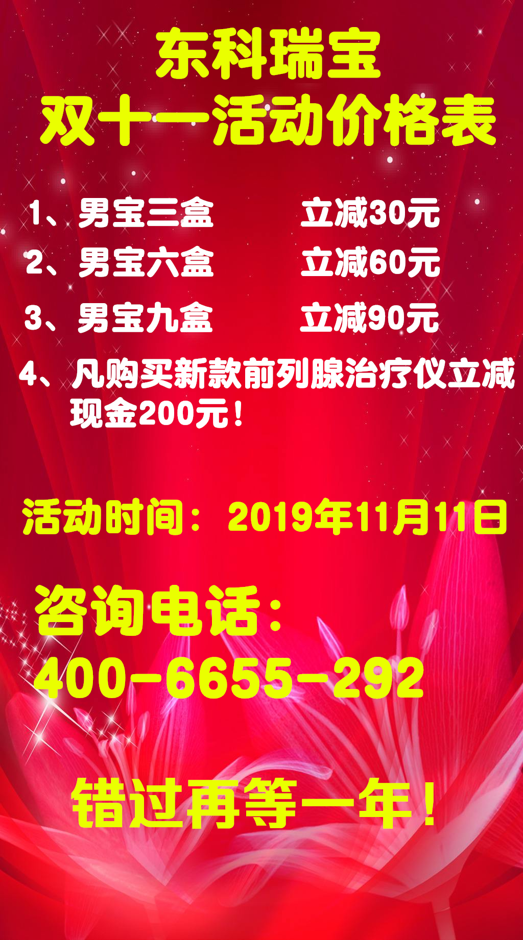 東科瑞寶前列腺治療儀雙十一大促 錯(cuò)過(guò)再等一年! 東科瑞寶前列腺治療儀廠家雙十一大促,購(gòu)買男寶抗菌凝膠3盒立減30,6盒立減60,9盒立減90!購(gòu)買新款儀器,立減現(xiàn)金200元!活動(dòng)僅限2019年11月11日當(dāng)天!錯(cuò)過(guò)再等一年!