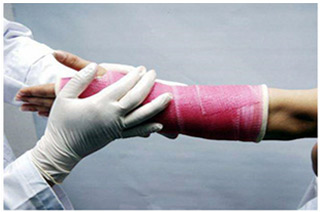 6、固定部位有皮外傷或需操作更長(zhǎng)時(shí)間時(shí),夾板可先不浸水,直接用紗布繃帶或彈性繃帶纏繞固定后在薄外層的無紡布上噴灑水來加速硬化;