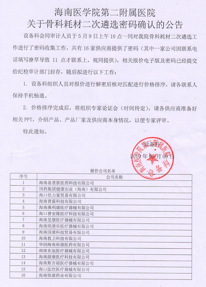 海南醫(yī)學(xué)院第二附屬醫(yī)院設(shè)備科會(huì)同審計(jì)人員于5月9日上午10點(diǎn),一同對我院骨科耗材二次遴選工作進(jìn)行了密碼收集工作,共有16家供應(yīng)商提供了密碼(其中一家公司因聯(lián)系電話填寫潦草導(dǎo)致11點(diǎn)才聯(lián)系上,視同提供),相關(guān)報(bào)價(jià)電子版及密碼己經(jīng)提交給紀(jì)檢審計(jì)部門封存,隨后擬進(jìn)行以下工作: